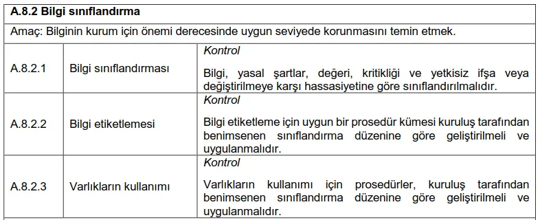 ISO27001:2013 Standardı Ek A.8.2 maddesi, Bilgi Sınıflandırma ile ilgili temel kontrolleri ve bunların amaçlarını şöyle tanımlıyor: